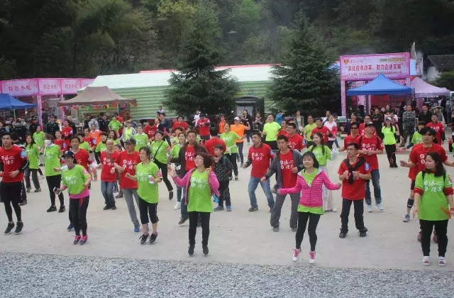 志愿者带领情侣做登山前准备活动