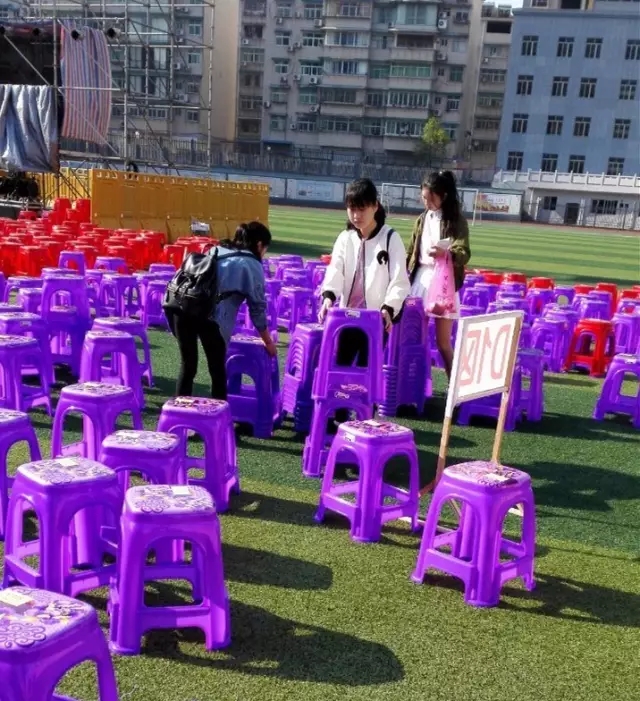 志愿者在晚会现场摆放桌椅