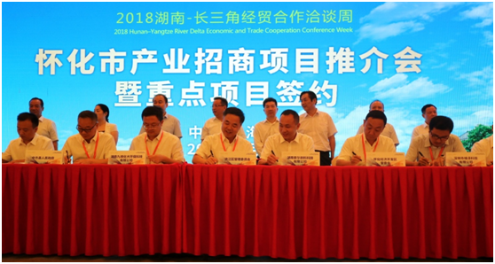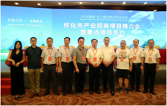 7月23日下午,“2018湖南—长三角经贸合作洽谈周”怀化市产业招商项目推介会暨重点项目签约仪式在上海举行。会上,洪江区工委副书记、区管委主任毛运鸿代表洪江区与湖南省索尔化工有限公司签约年产6万吨氧化铁颜料项目。区领导黄文胜、易左参加。