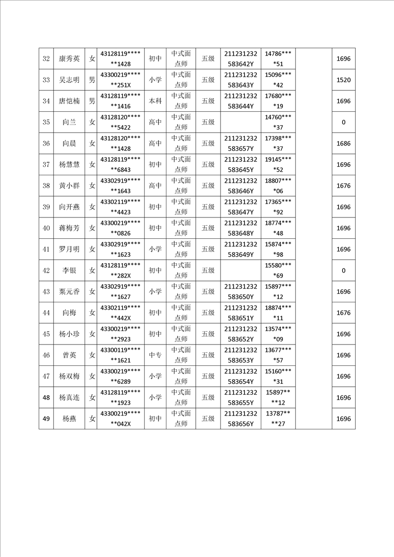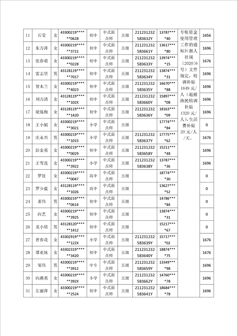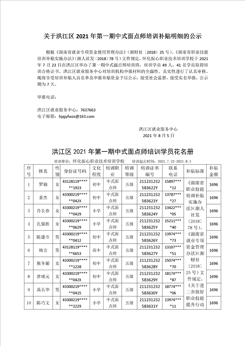 洪江区2021年第1期中式面点师培训补贴明细的公示