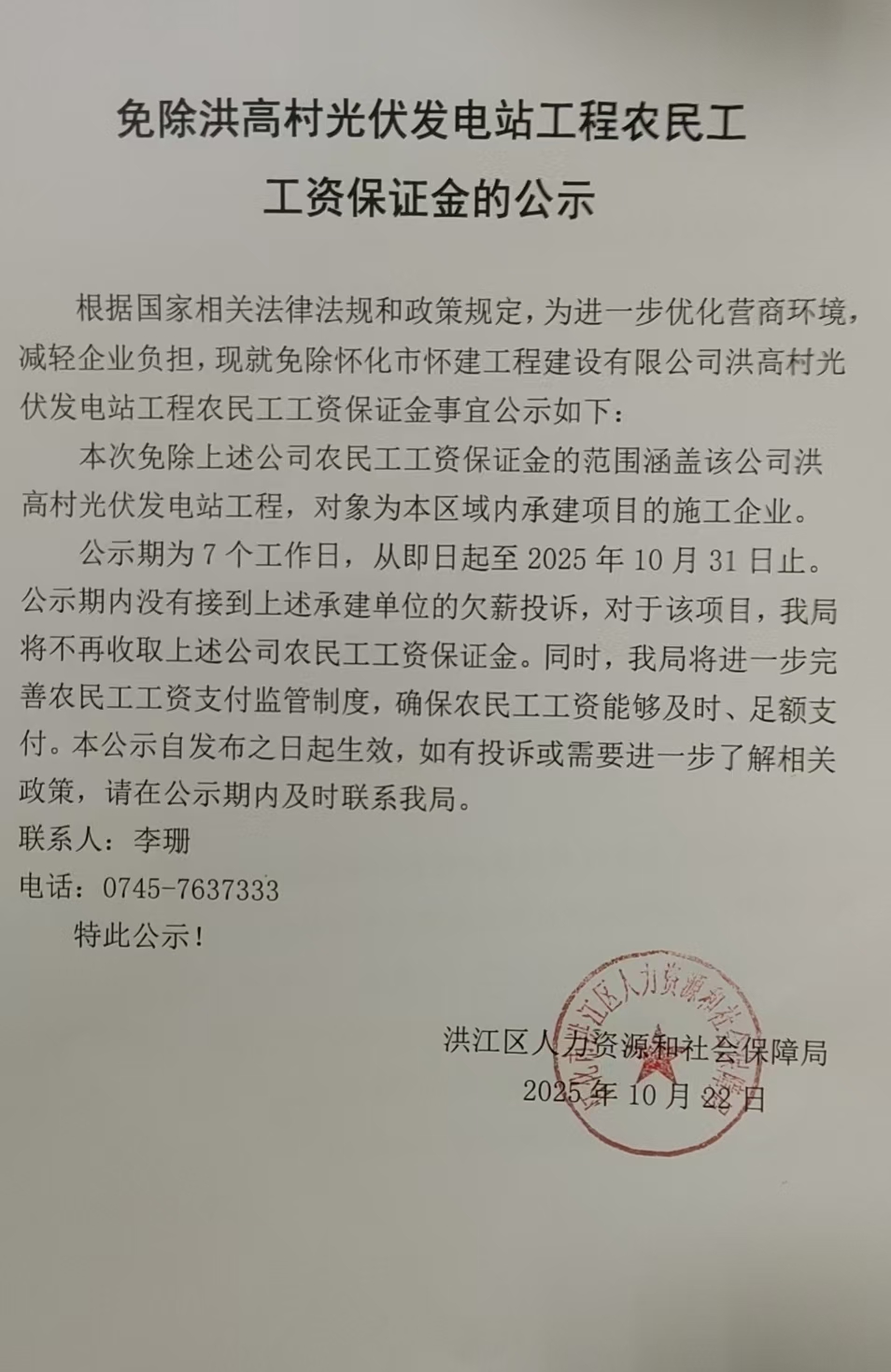 免除洪高村光伏发电站工程农民工工资保证金的公示