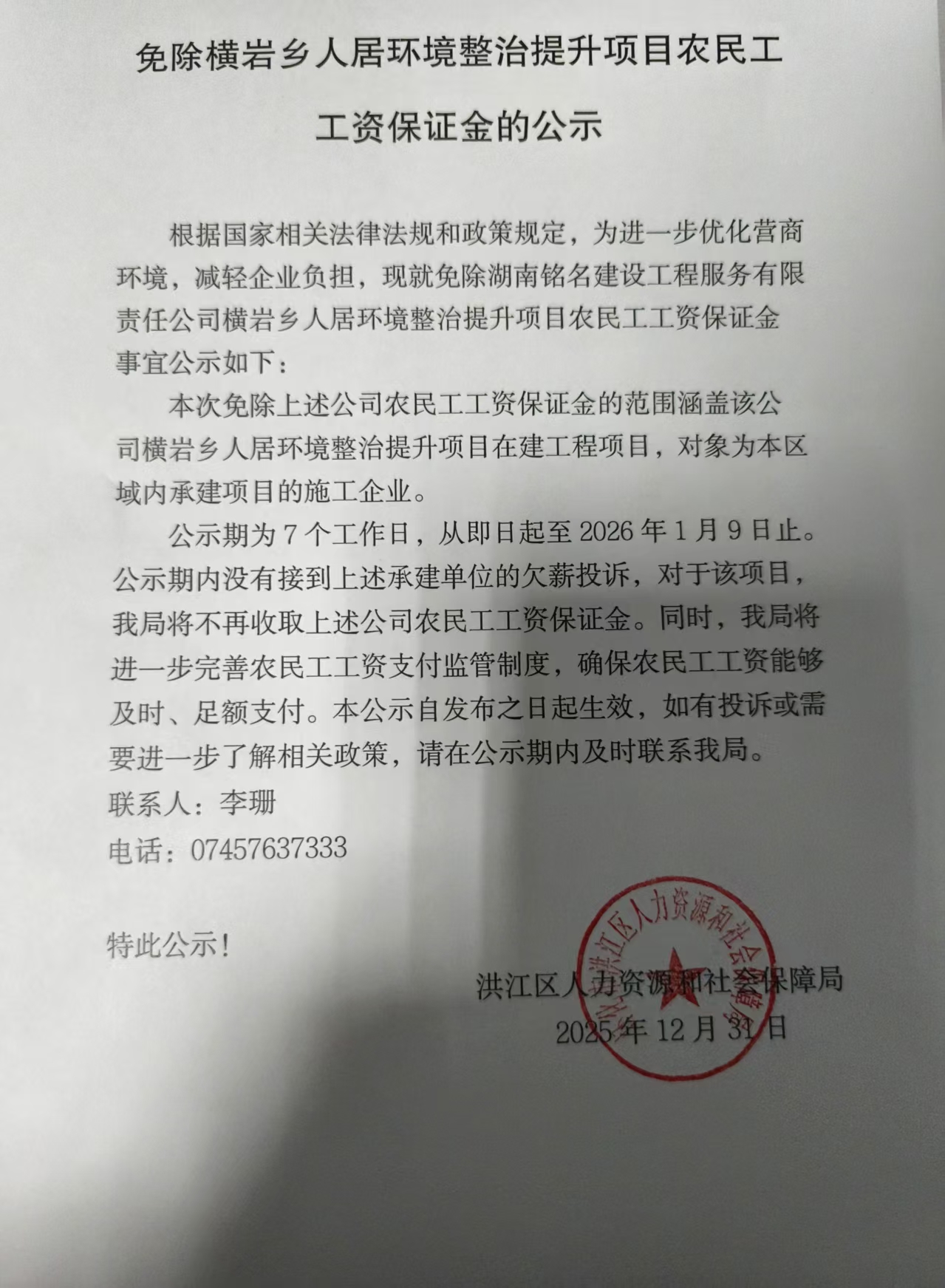 免除横岩乡人居环境整治提升项目农民工工资保证金的公示