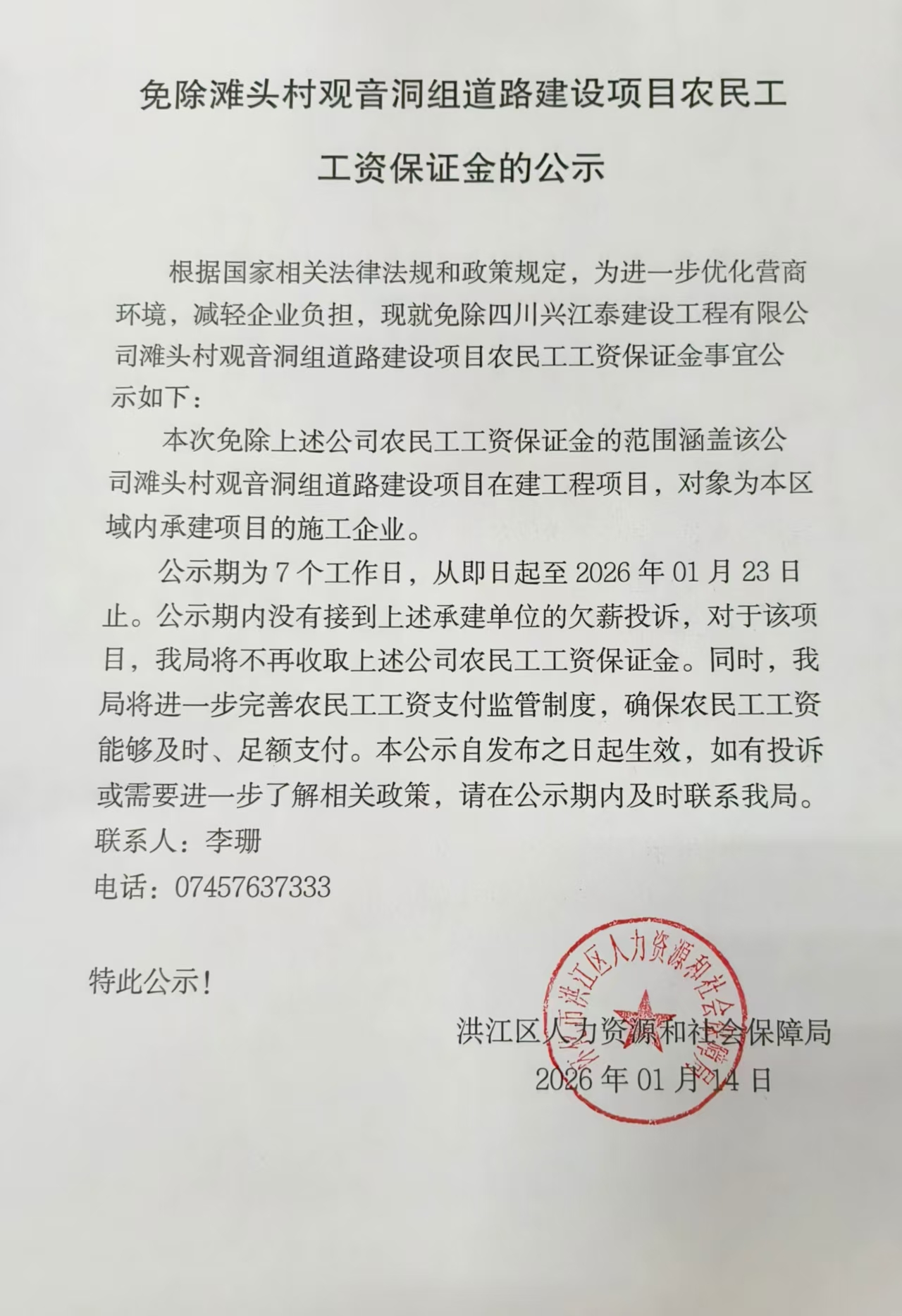 免除滩头村观音洞组道路建设项目农民工工资保证金的公示