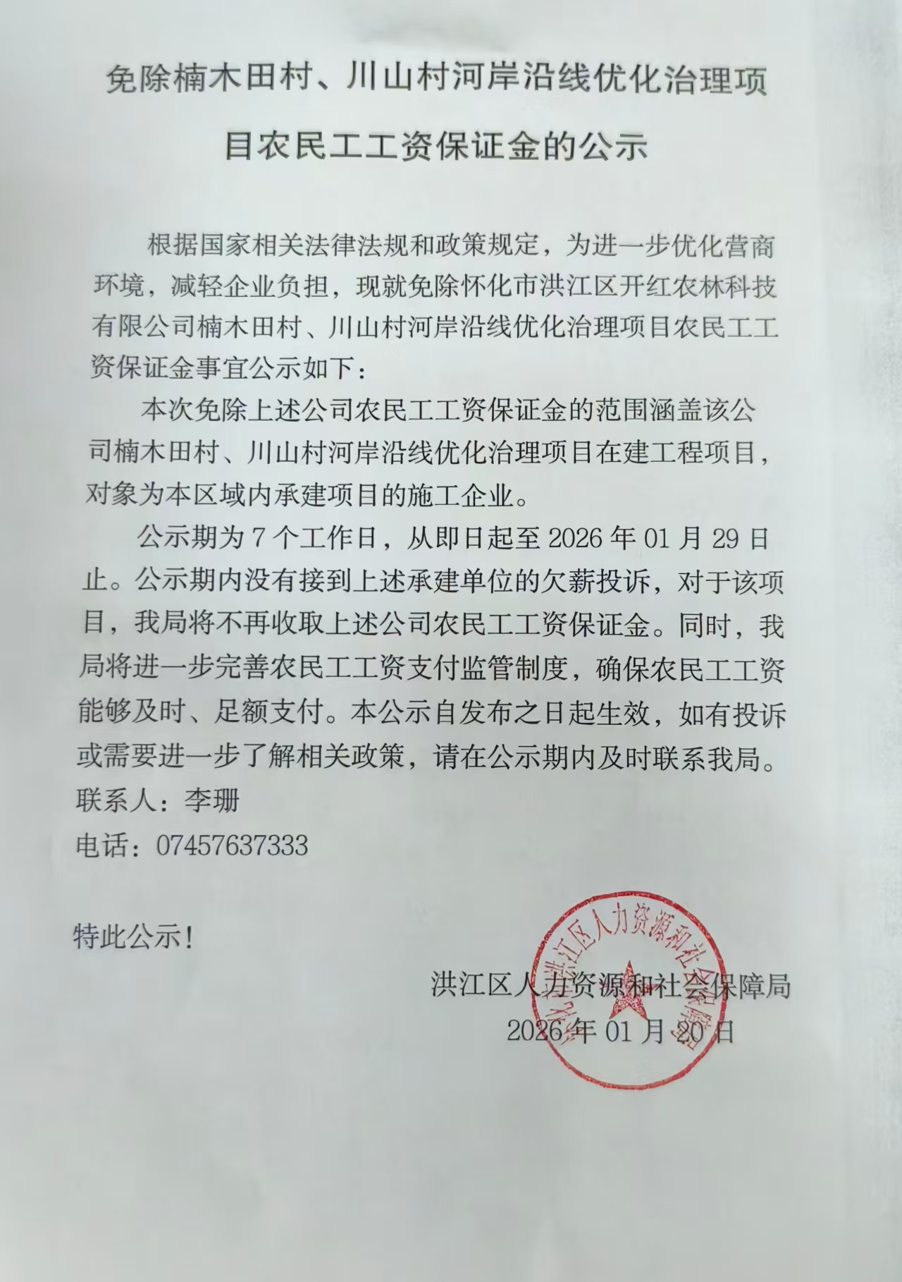 免除楠木田村、川山村河岸沿线优化治理项目农民工工资保证金的公示