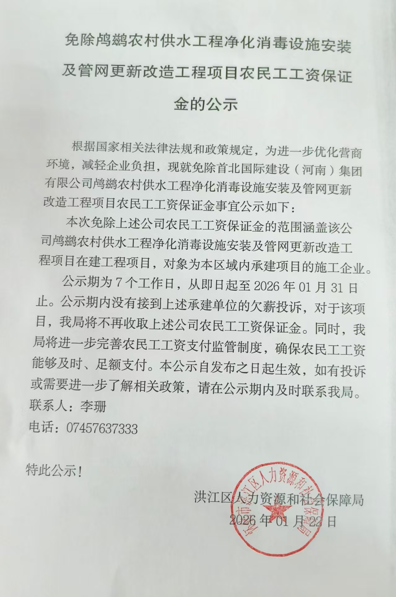 免除鸬鹚农村供水工程净化消毒设施安装及管网更新改造工程项目农民工工资保证金的公示