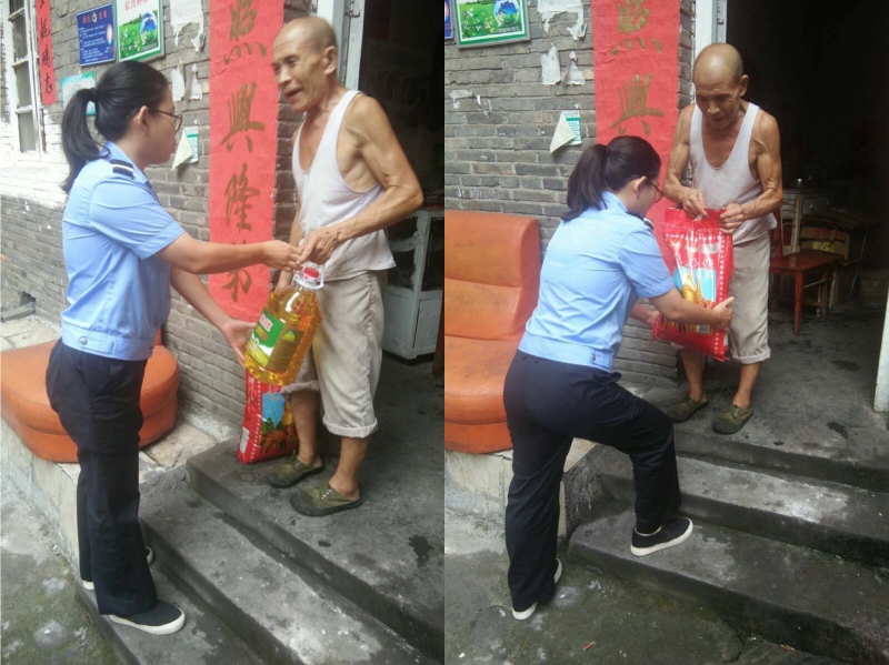 在戴天邦老人家中,社区工作人员和街道派出所民警通过拉家常的方式,详细了解老人近期身体状况和日常生活情况,询问老人在生活中遇到的困难,有针对性地进行心理咨询和心理疏导,并送上大米和食用油等生活物资。除此之外,社区工作人员将“便民联系卡”送到老人手中,方便老人能够及时联系社区工作人员上门服务。对社区工作人员的到来,戴大爷连声说道“这么热的天还上门来慰问,真是谢谢你们了”。