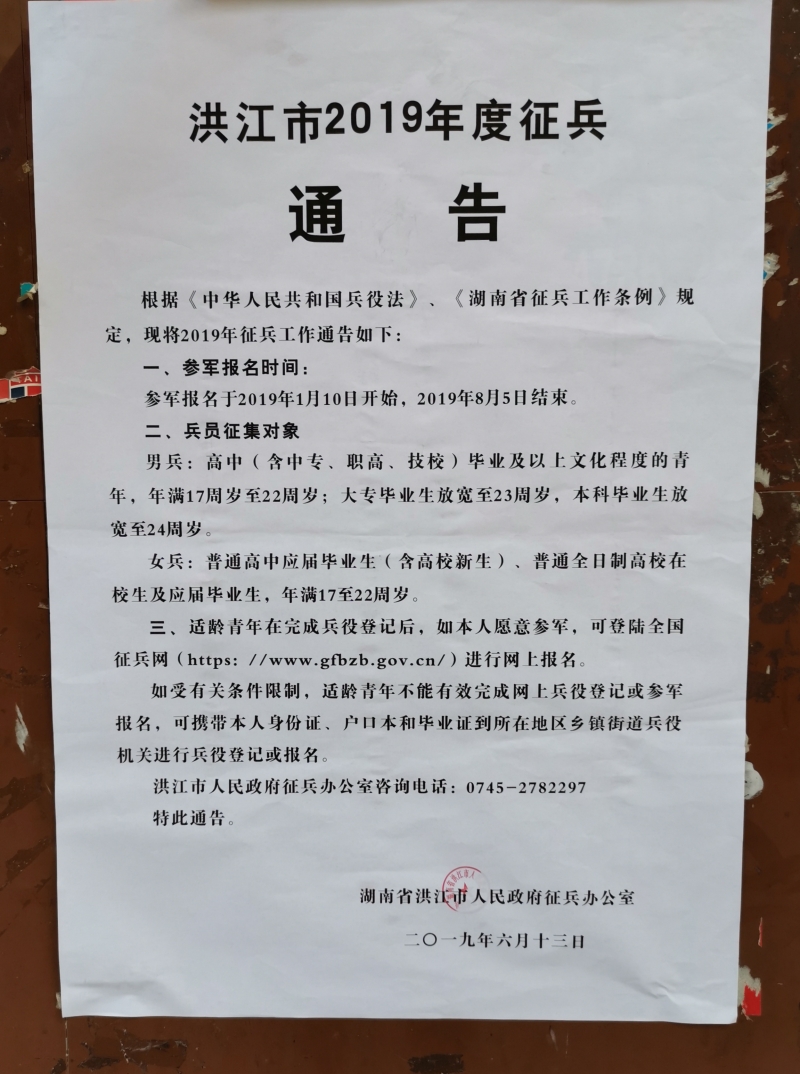 据了解,2019年的征兵报名工作目前已开始,截止到2019年8月5日。适龄青年可登录全国征兵网(www.gfbzb.gov.cn)进行网上报名,也可携带本人身份证、户口本和毕业证到本人所在乡镇街道兵役机关进行现场报名登记。(通讯员:李作文)
