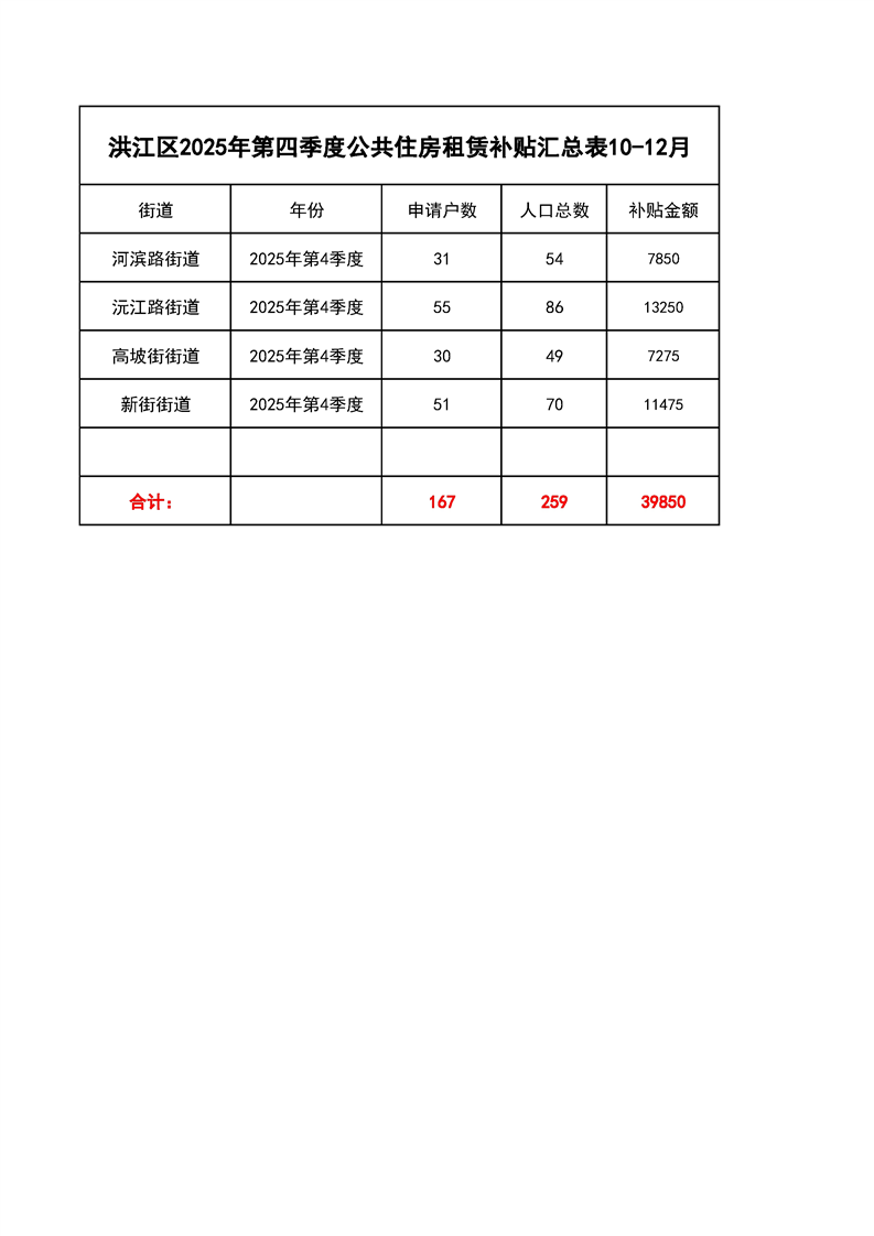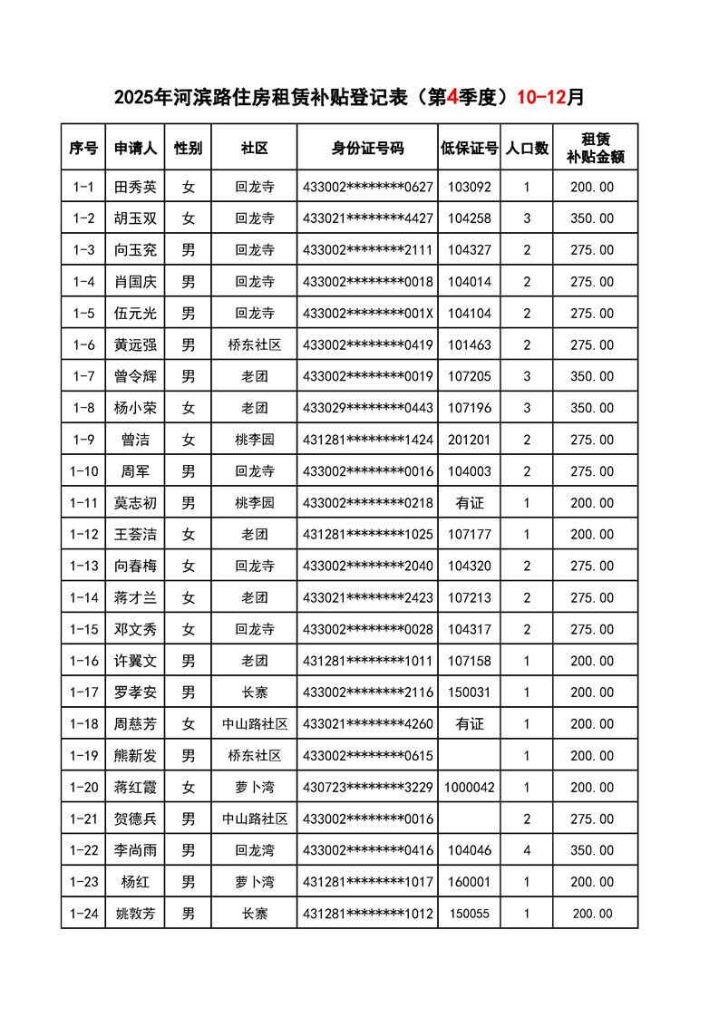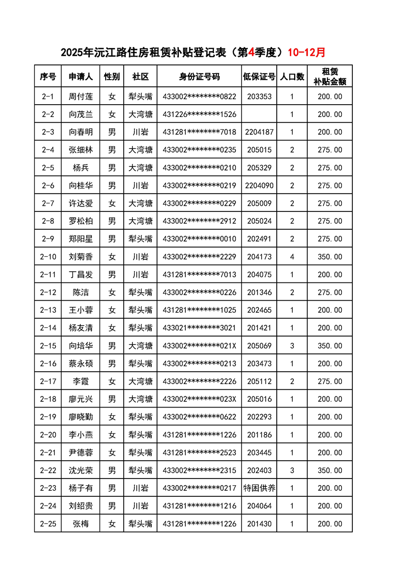 洪江区2025年第四季度公共租赁住房租赁补贴名单公示