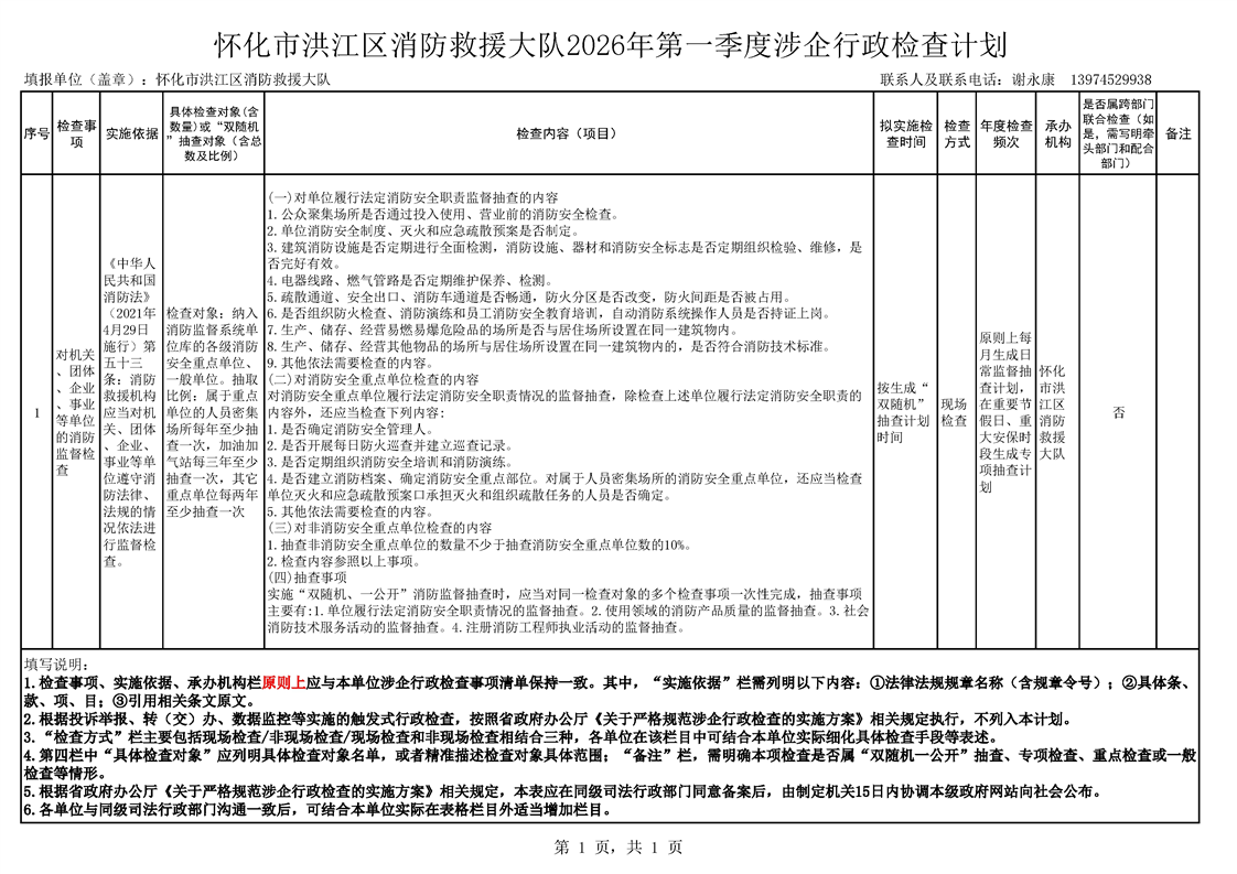 怀化市洪江区消防救援大队2026年第一季度涉企行政检查计划