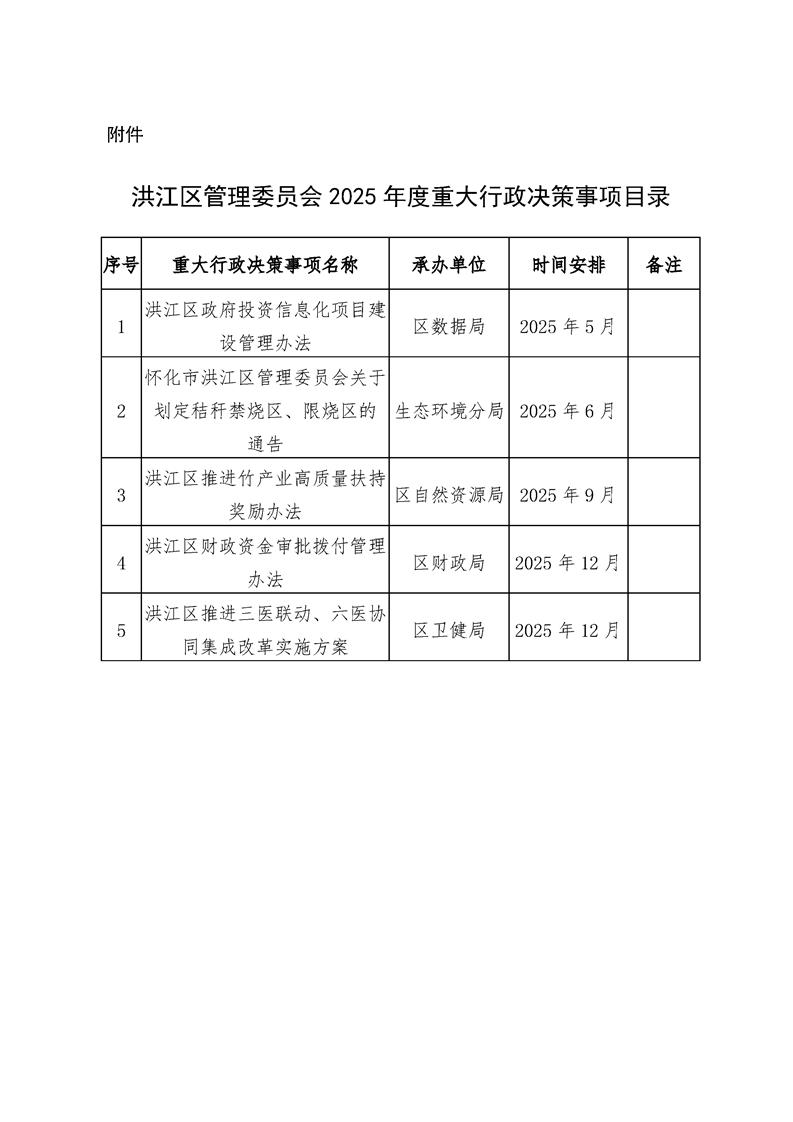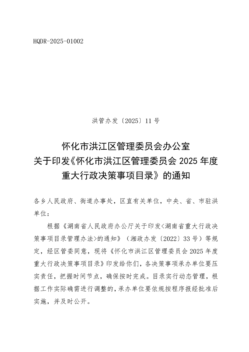 怀化市洪江区管理委员会办公室关于印发《怀化市洪江区管理委员会2025年度重大行政决策事项目录》的通知