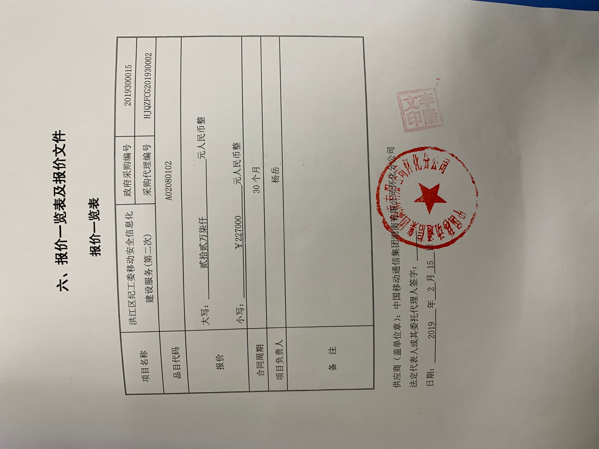 中共洪江区纪律检查工作委员会的洪江区纪工委移动安全信息化建设服务(第二次)项目单一来源采购项目于2019年2月15结束,现将成交结果公告如下: