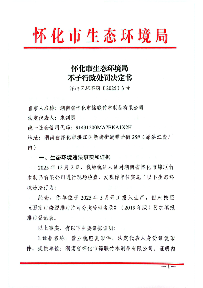 湖南省怀化市锦联竹木制品有限公司行政处罚决定书