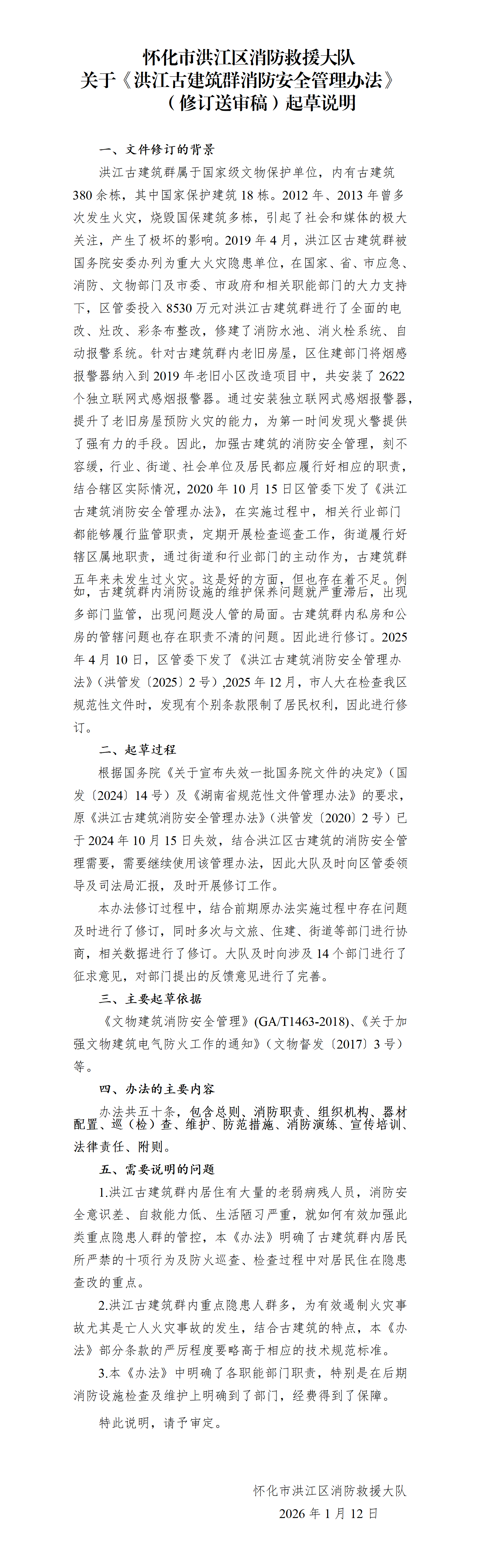 怀化市洪江区消防救援大队关于《洪江古建筑群消防安全管理办法》(修订送审稿)起草说明