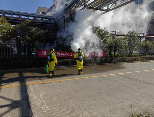 园区专业应急救援队伍接警后,紧随其后抵达现场,布设消防水带,采用雾状水喷洒措施吸附有毒气体。