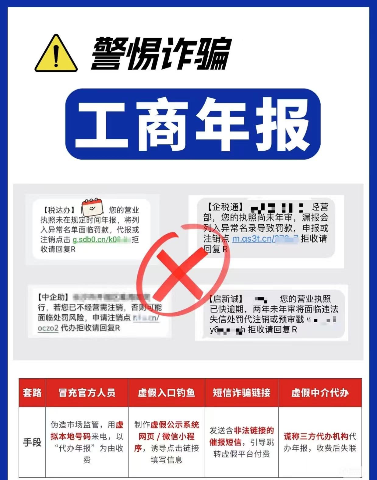 1.身份冒充型:不法分子伪装成市场监管工作人员,通过电话或短信告知"年报逾期将被列入经营异常名录、影响征信",利用经营主体的恐慌心理诱导付费。