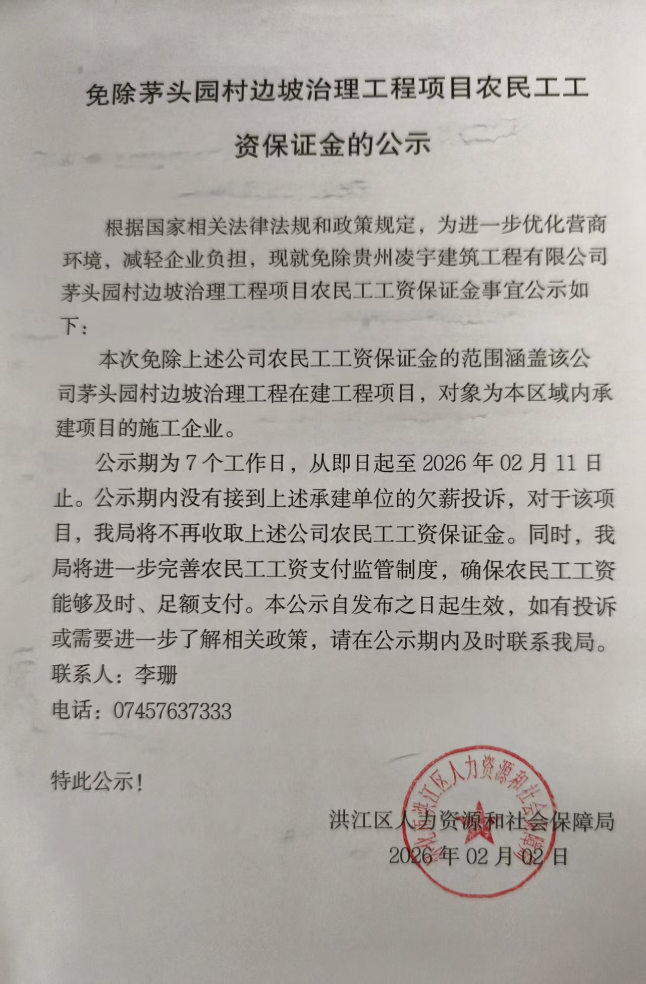 免除茅头园村边坡治理工程项目农民工工资保证金的公示