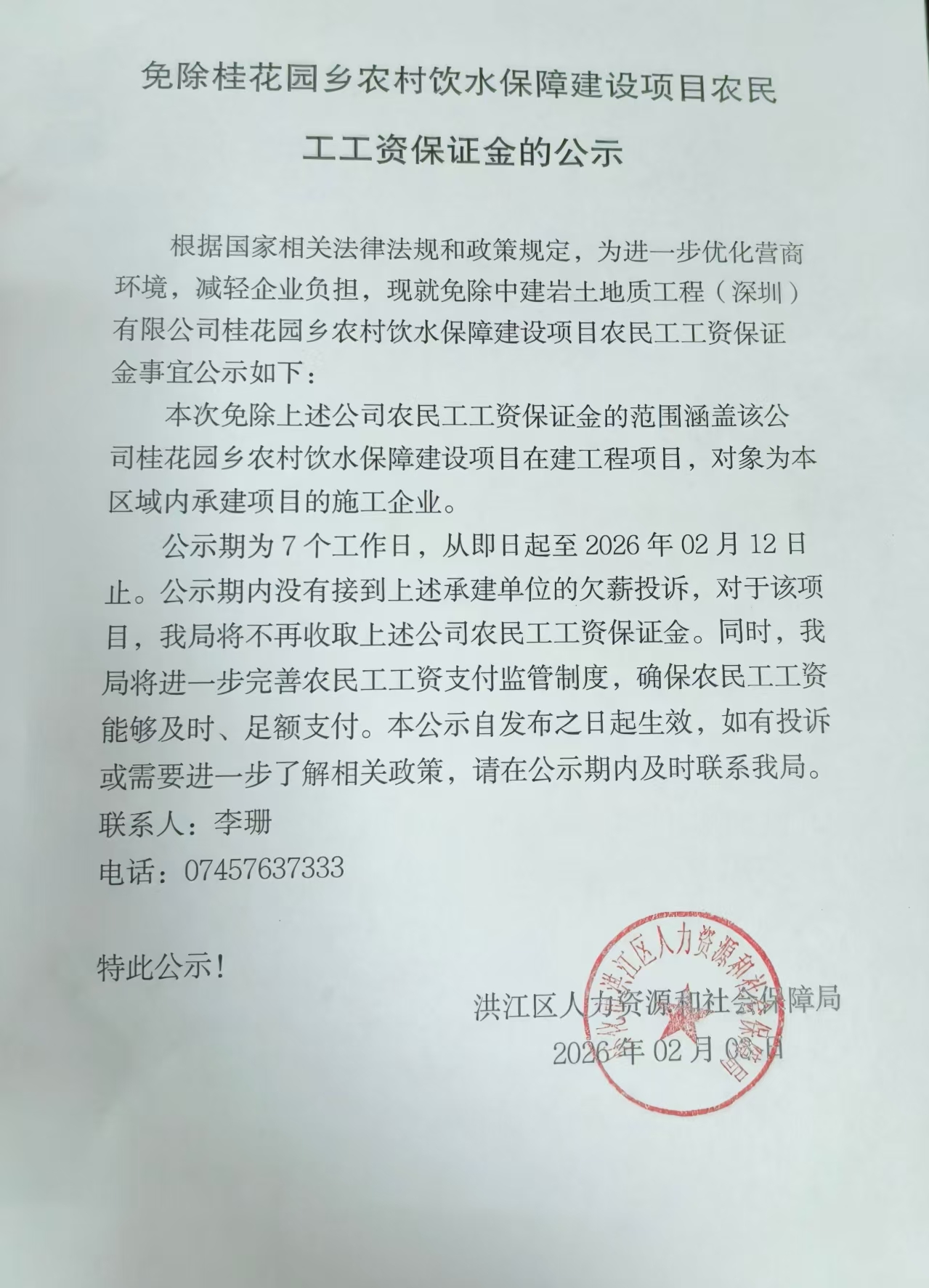 免除桂花园乡农村饮水保障建设项目农民工工资保证金的公示