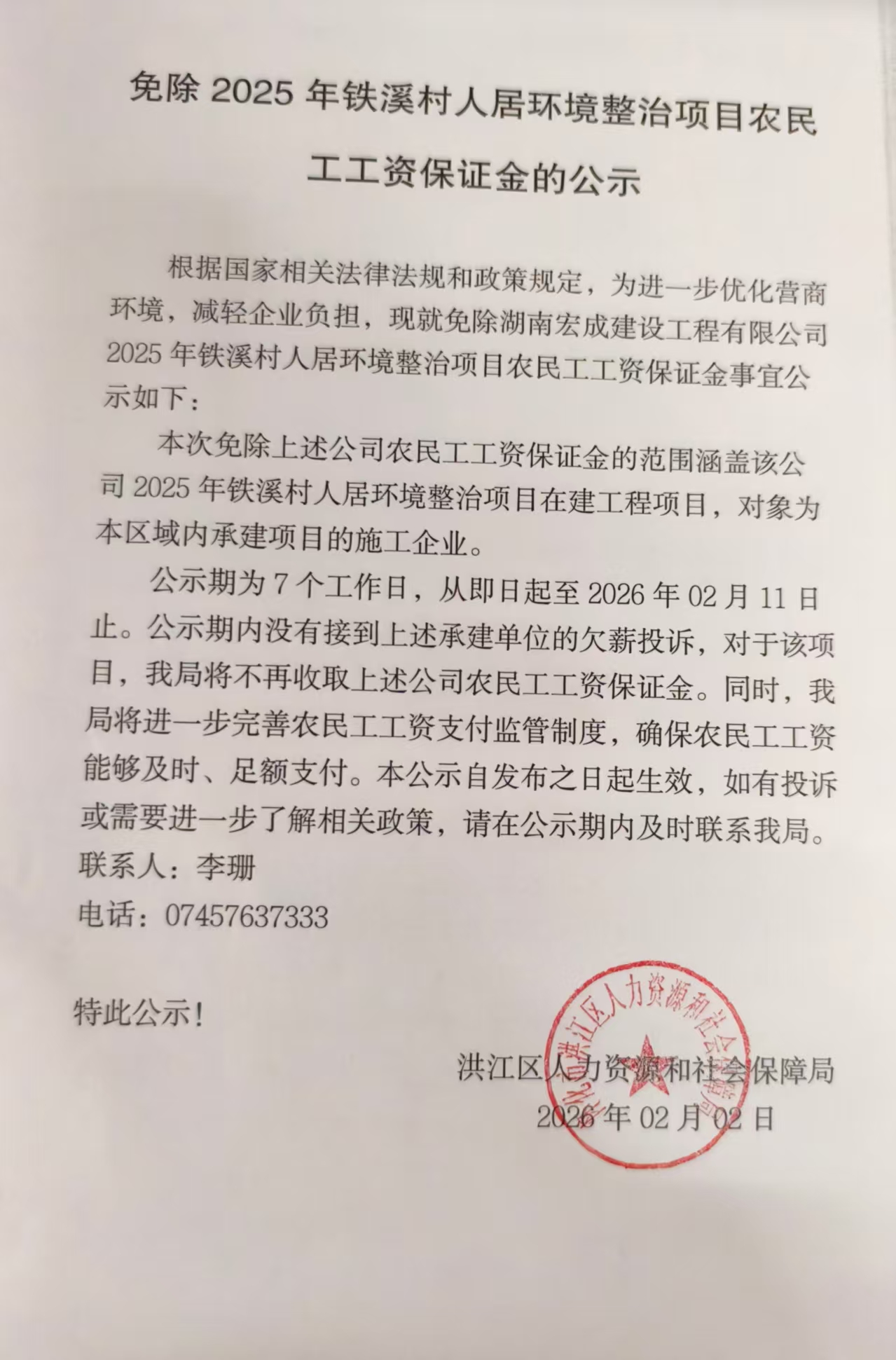 免除2025年铁溪村人居环境整治项目农民工工资保证金的公示