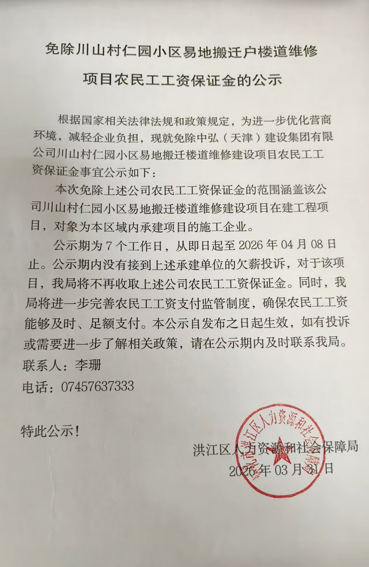 免除川山村仁园小区易地搬迁户楼道维修项目农民工工资保证金的公示