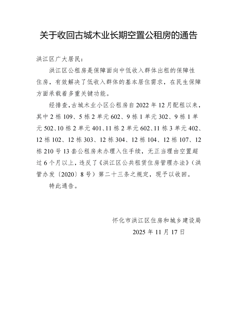关于收回古城木业长期空置公租房的通告