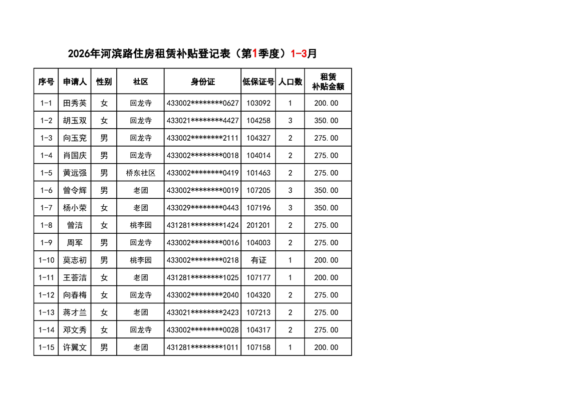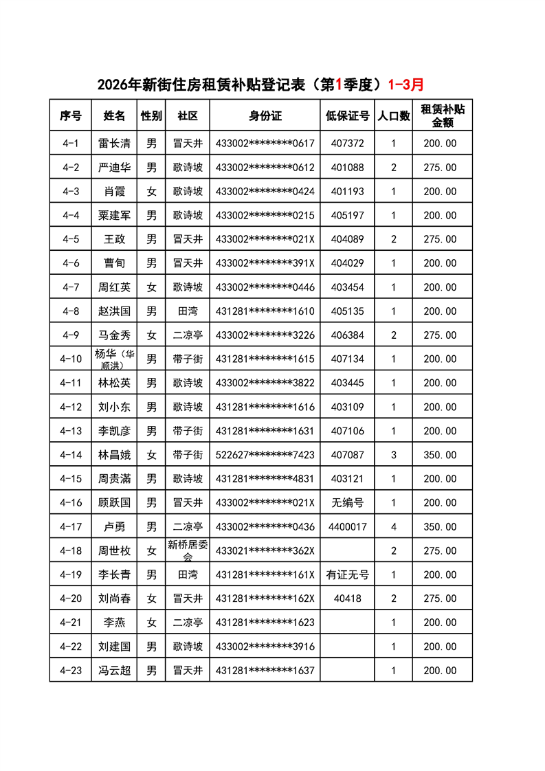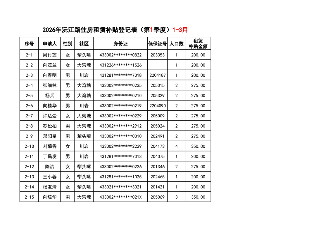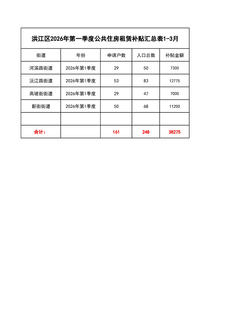 洪江区2026年第一季度公共租赁住房租赁补贴名单公示
