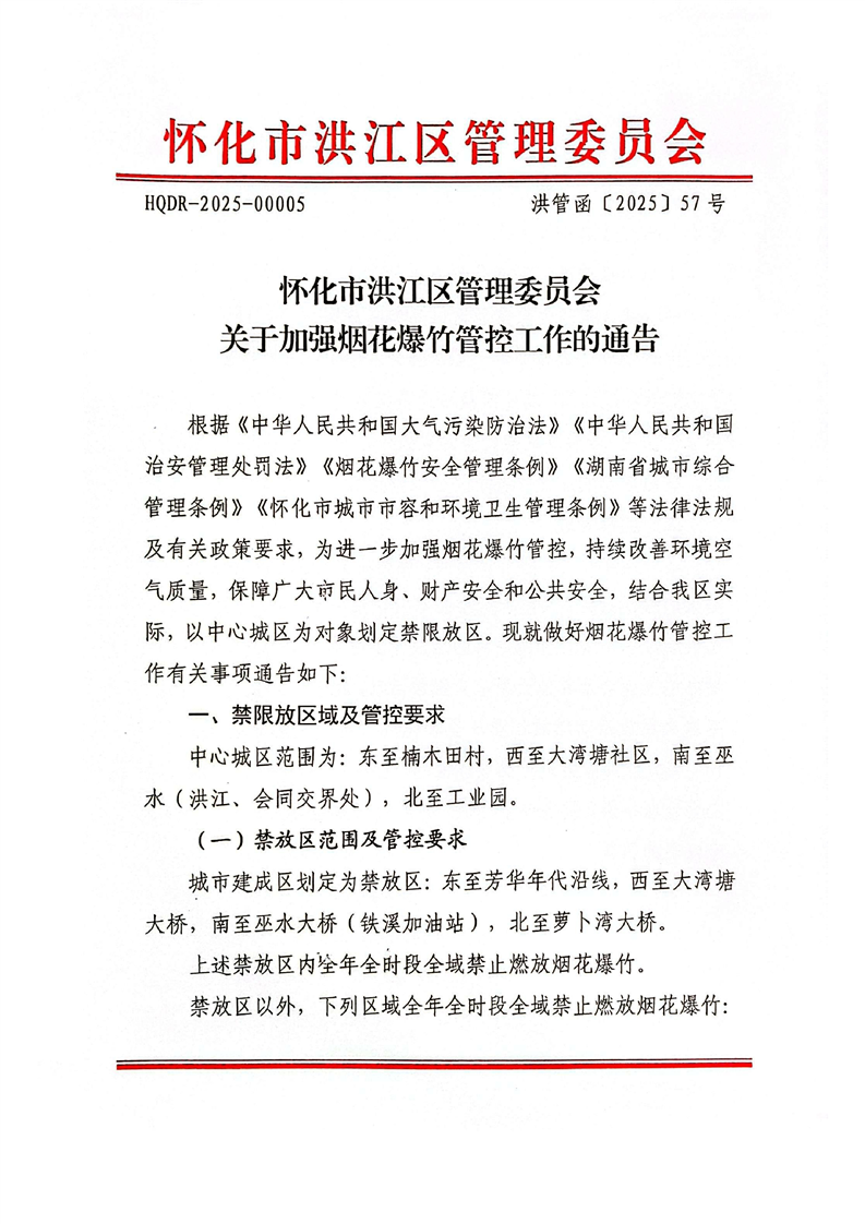 怀化市洪江区管理委员会关于加强烟花爆竹管控工作的通知