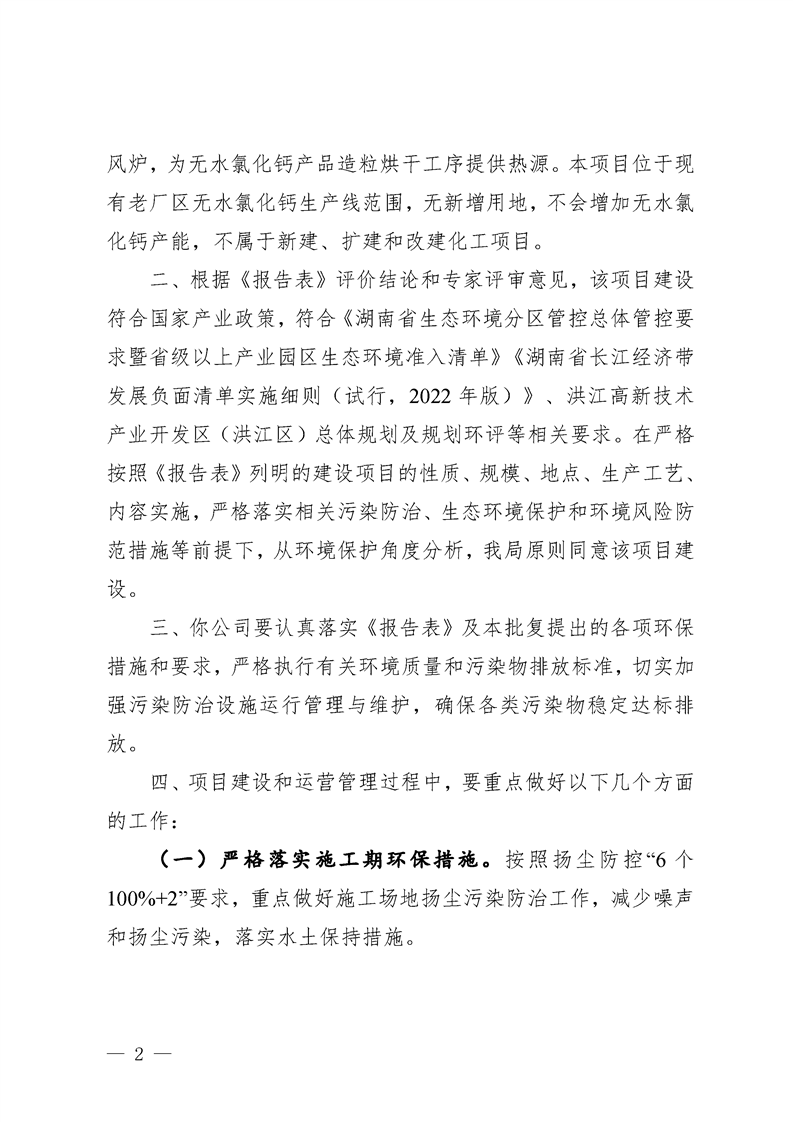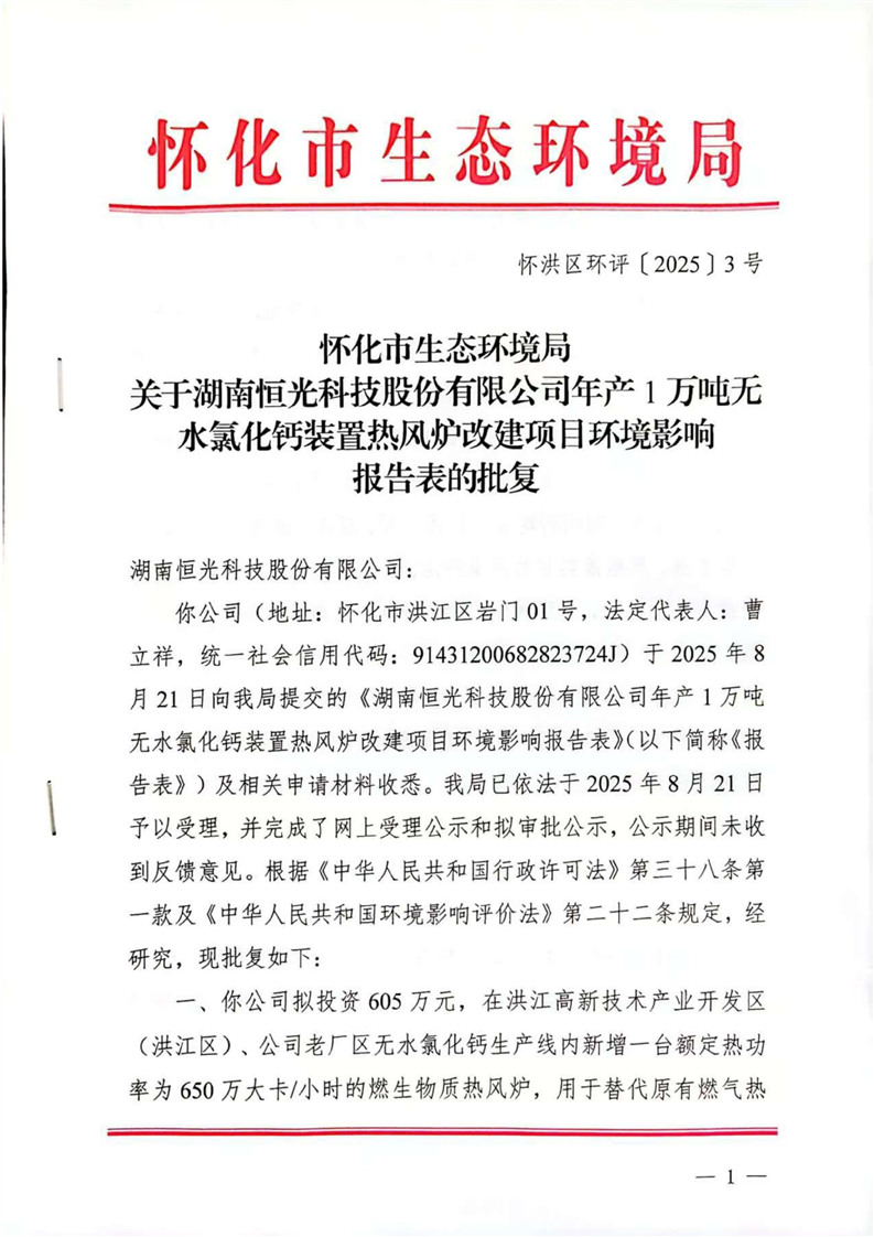 关于怀化市生态环境局关于湖南恒光科技股份有限公司年产1万吨无水氯化钙装置热风炉改建项目环境影响报告表的批复
