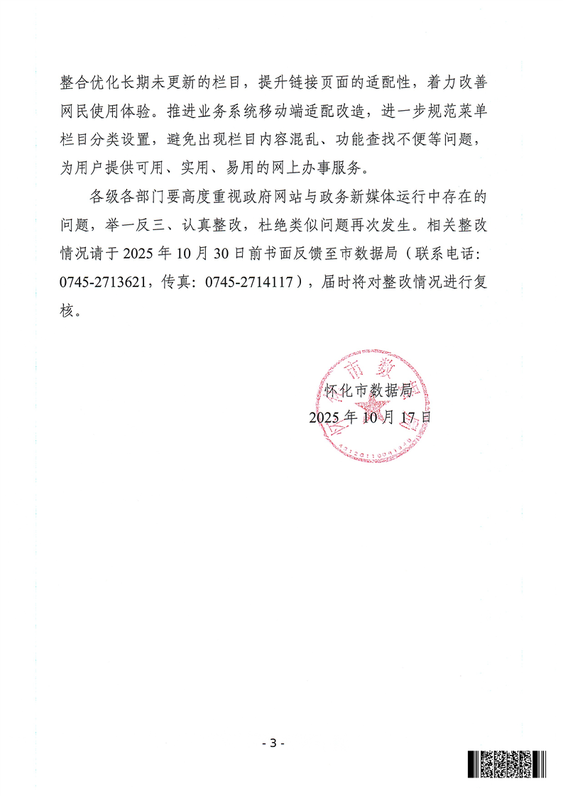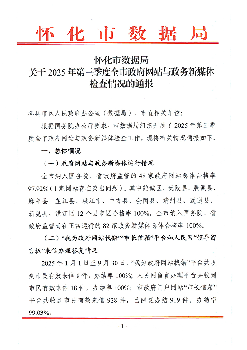 怀化市数据局关于2025年第三季度全市政府网站与政务新媒体检查情况的通报