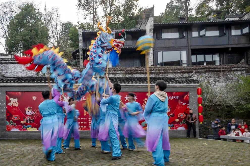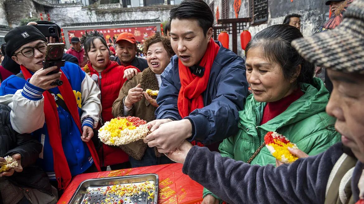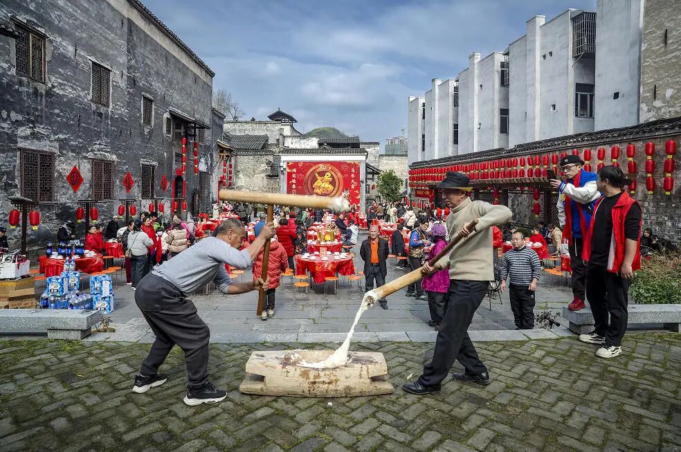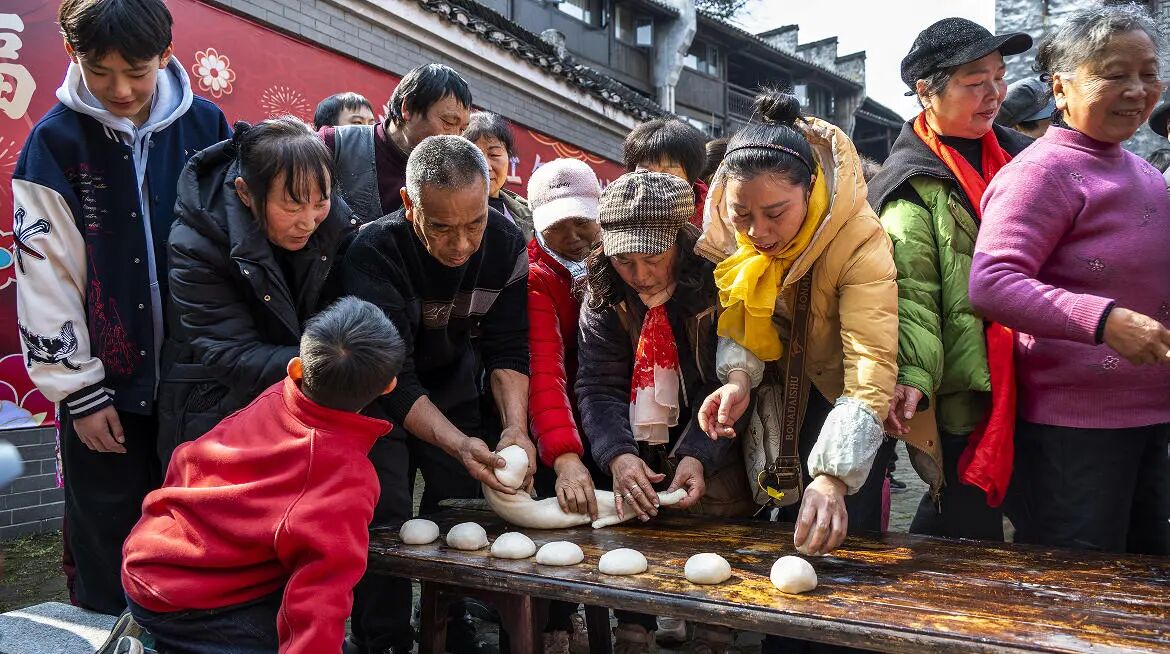 福宴未开,烟火先暖。下午,留园早已变成热闹的海洋。歌舞表演、草龙表演精彩连连。留园内翰墨飘香,书法爱好者挥毫泼墨,给当地居民写春联、送“福”字,吸引了前来求取对联的群众。不远处糯香阵阵,“福锤声声打糍粑”活动正在热闹进行,不少游客和市民纷纷上阵体验,捶打声此起彼伏。“酥脆又爽口,真是太美味了。”窨子屋里,当地美食春卷、泡茶被炸得滋滋作响,香气四溢,吸引了众人争相品尝,纷纷点赞。