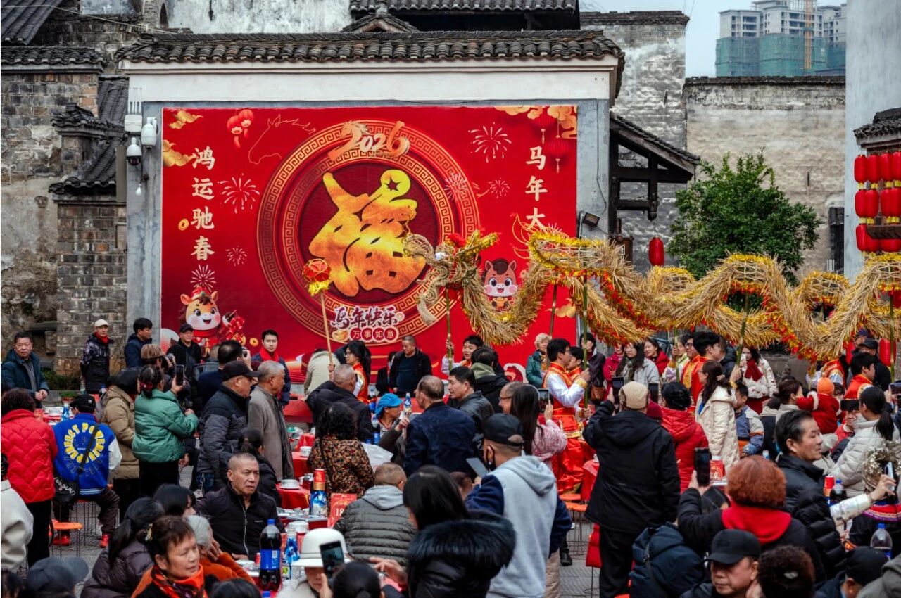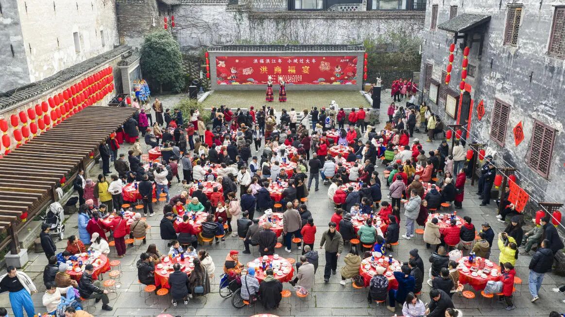 洪江区融媒体中心消息(特邀通讯员:林振林)红灯笼映着青石板,古商城飘出美食香。2月11日,南方小年,湖南洪江古商城留园人声鼎沸,40张大圆桌整齐排列,“洪福洪江年·小城过大年”系列活动“洪商福宴”热闹举行,洪江古商城居民与各地游客欢聚一堂,在烟火气中品味洪江的年味与温情。
