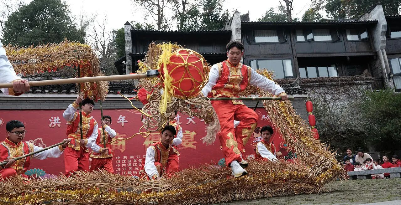怀化市非物质文化遗产“草龙”舞动着穿梭于桌席间,给游客和市民送上祝福。“吃商帮菜,发天下财”“弟兄好、四季财、六六顺……”酒席间,吆喝声、划拳行酒令的欢笑声交织在一起,回荡在留园上空,形成一幅热闹非凡的新春画卷 。